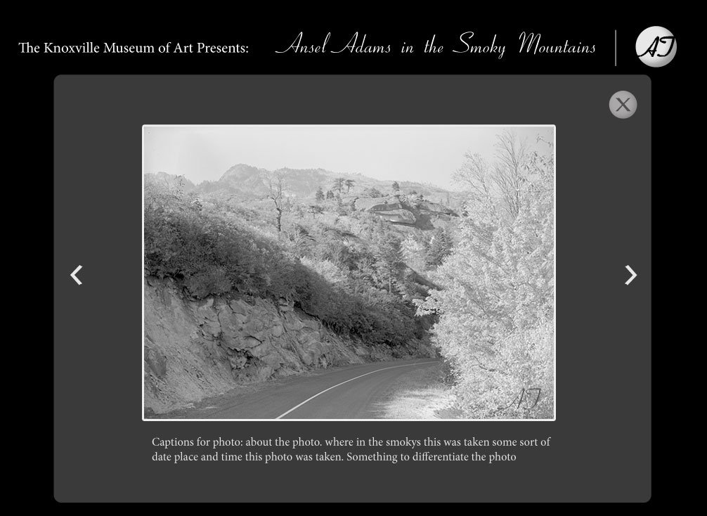 As a developer for Digital Media Graphix, I performed as the programer for the Knoxville Museum of Art. I developed and designed the Ansel Adams Photo Kiosk to display the work of Ansel Adams in a user friendly gallery setting that performed as both a display and educational tool. I created full application design, development and installation of the kiosk application.
